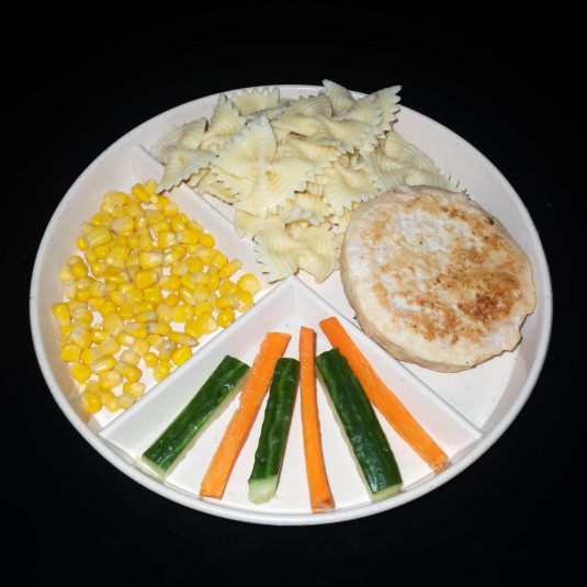 Макароны, котлета из курицы и сыра моцарелла, сладкая кукуруза, морковь, огурец