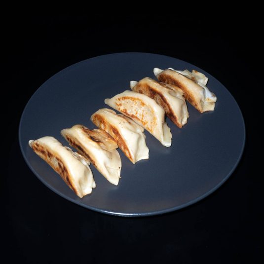 Тесто, фарш из креветок и свежей капусты, лук зеленый , соус понзу